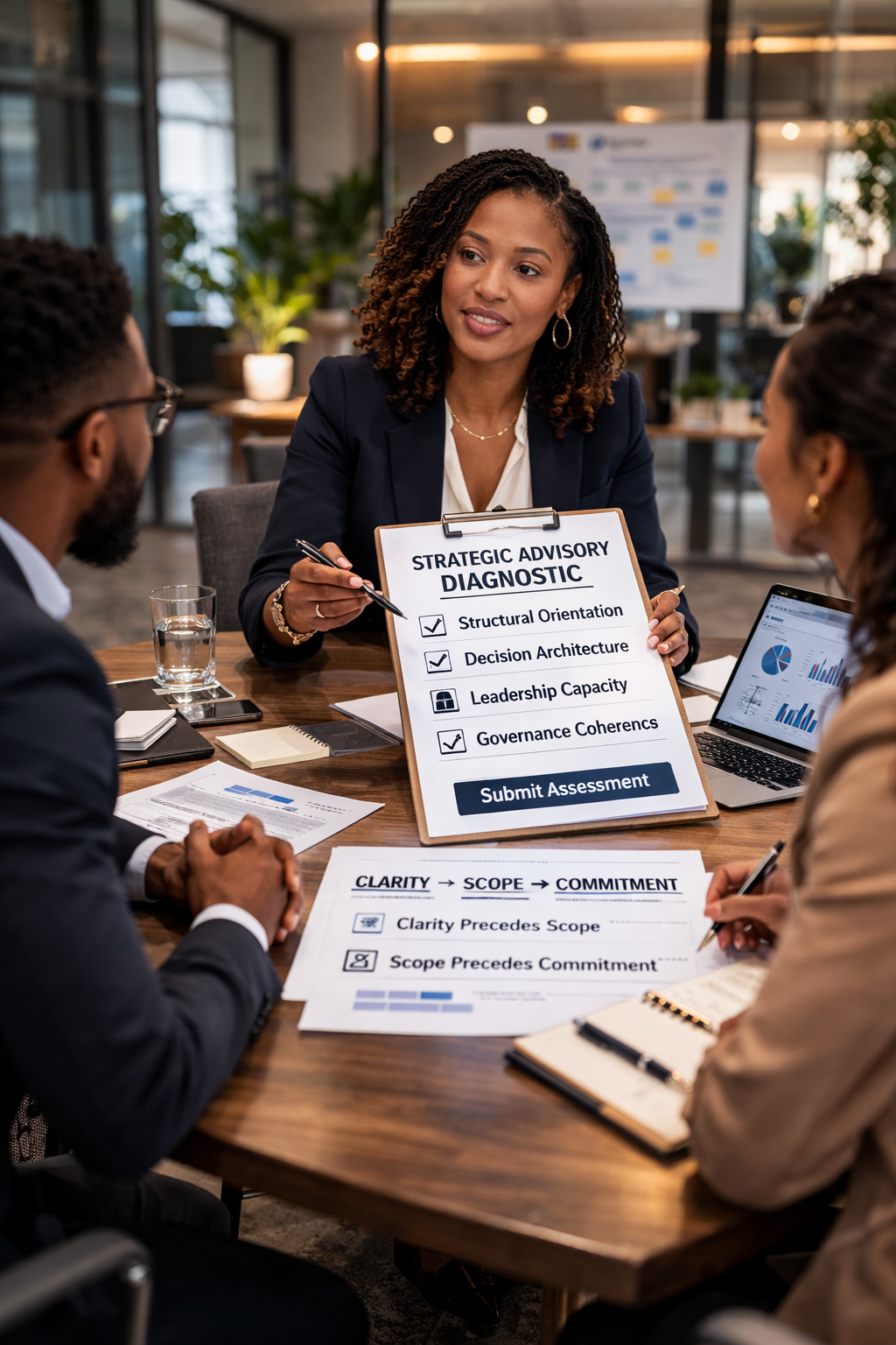 The diagnostic evaluates structural orientation, decision architecture, leadership capacity, and governance coherence.